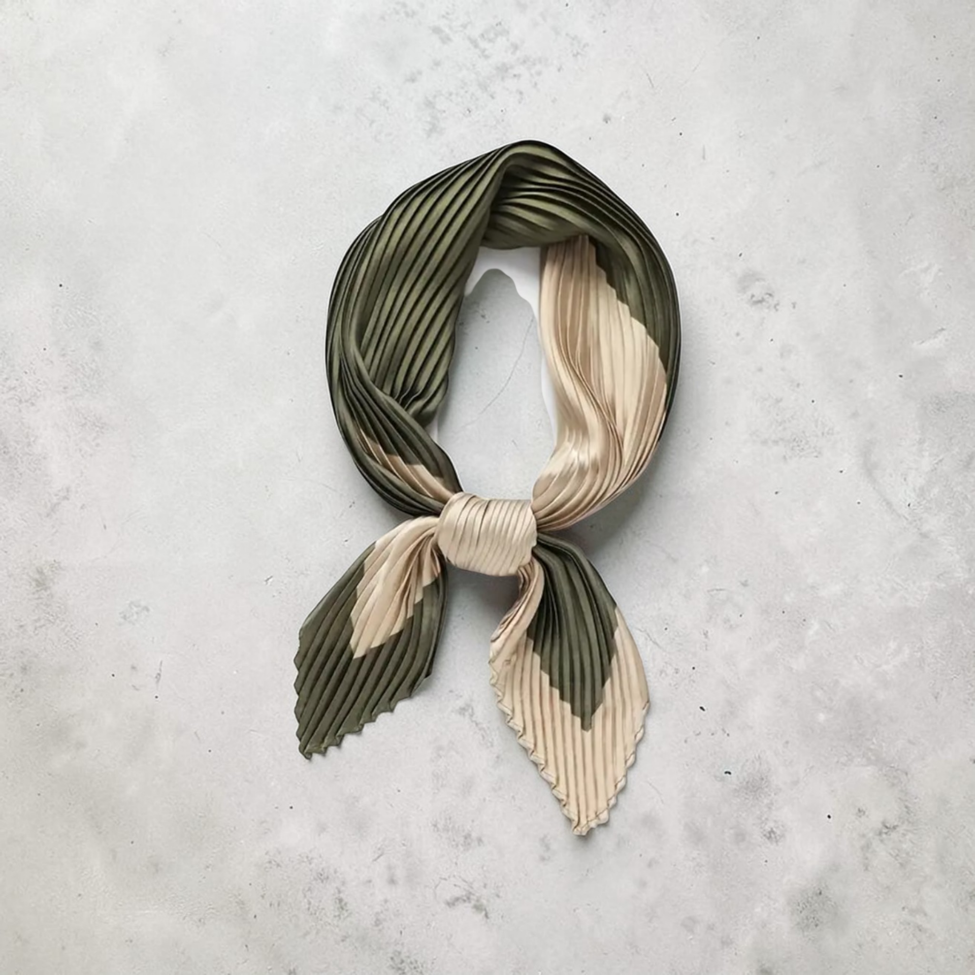 Voeg een verfijnd kleuraccent toe aan je outfit met dit prachtige geplooide sjaaltje. De combinatie van diep olijfgroen en warm zandgeel vloeit samen in een stijlvol grafisch patroon, wat zorgt voor een moderne en natuurlijke uitstraling.